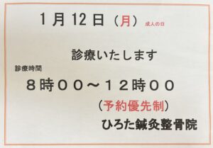 1月12日(月)成人の日 診療時間のお知らせ